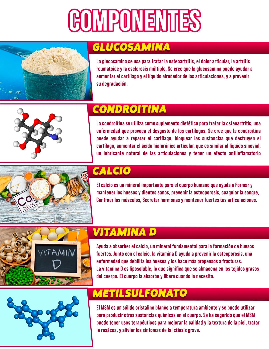 - Previene y trata el desgaste de las articulaciones y la pérdida de masa ósea.
